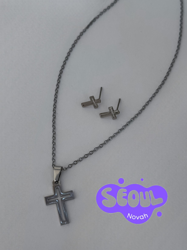 نیم ست دارای یک جفت گوشواره میخی، یک عدد پلاک همراه با زنجیر استیل ۴۹ سانتی متری است