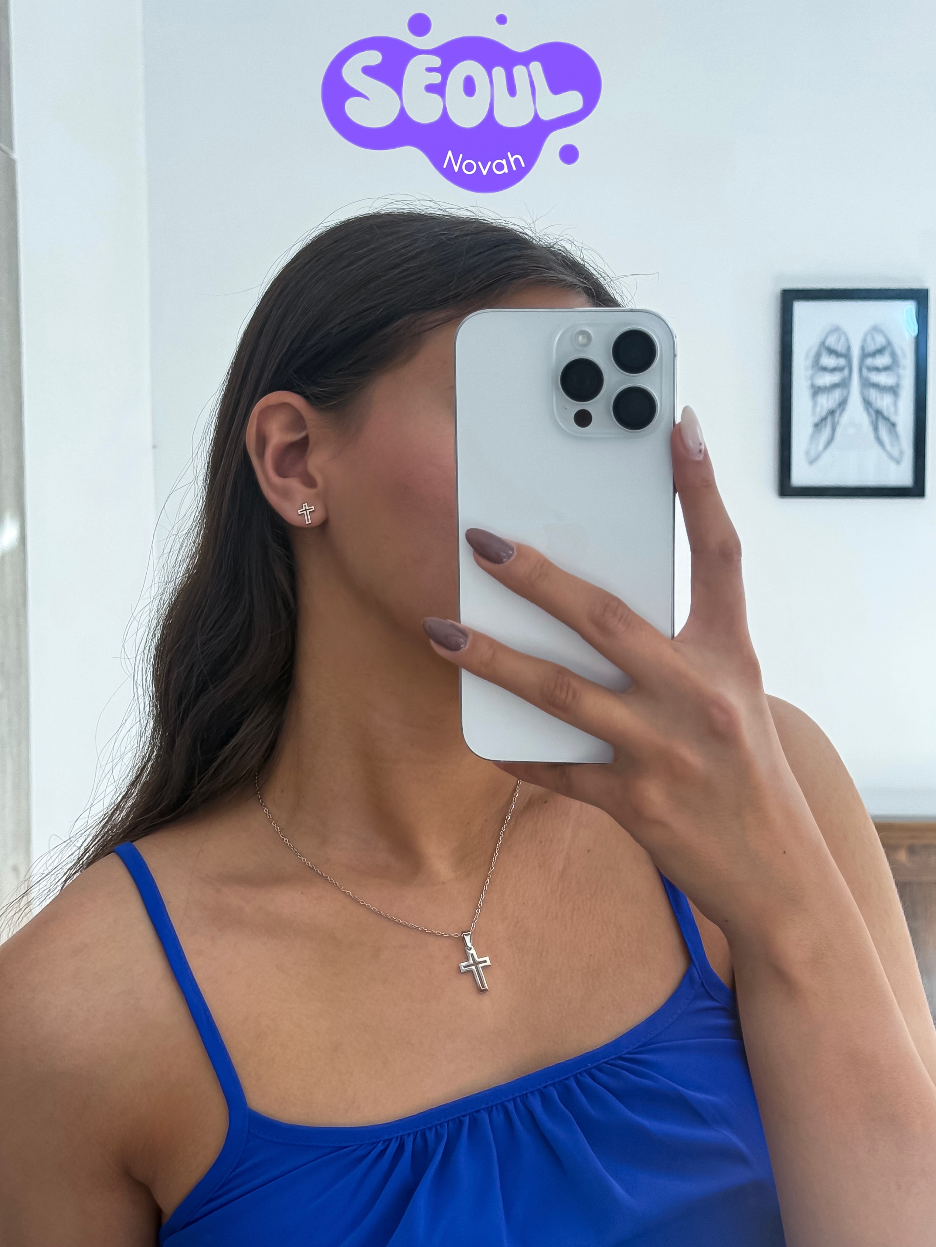 نیم ست دارای یک جفت گوشواره میخی، یک عدد پلاک همراه با زنجیر استیل ۴۹ سانتی متری است